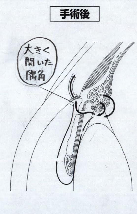 白内障のために膨隆した水晶体は、狭隅角化の大きな原因です。白内障手術で挿入する眼内レンズは元々の水晶体に比べればはるかに薄く、術後隅角は大きく開きます。