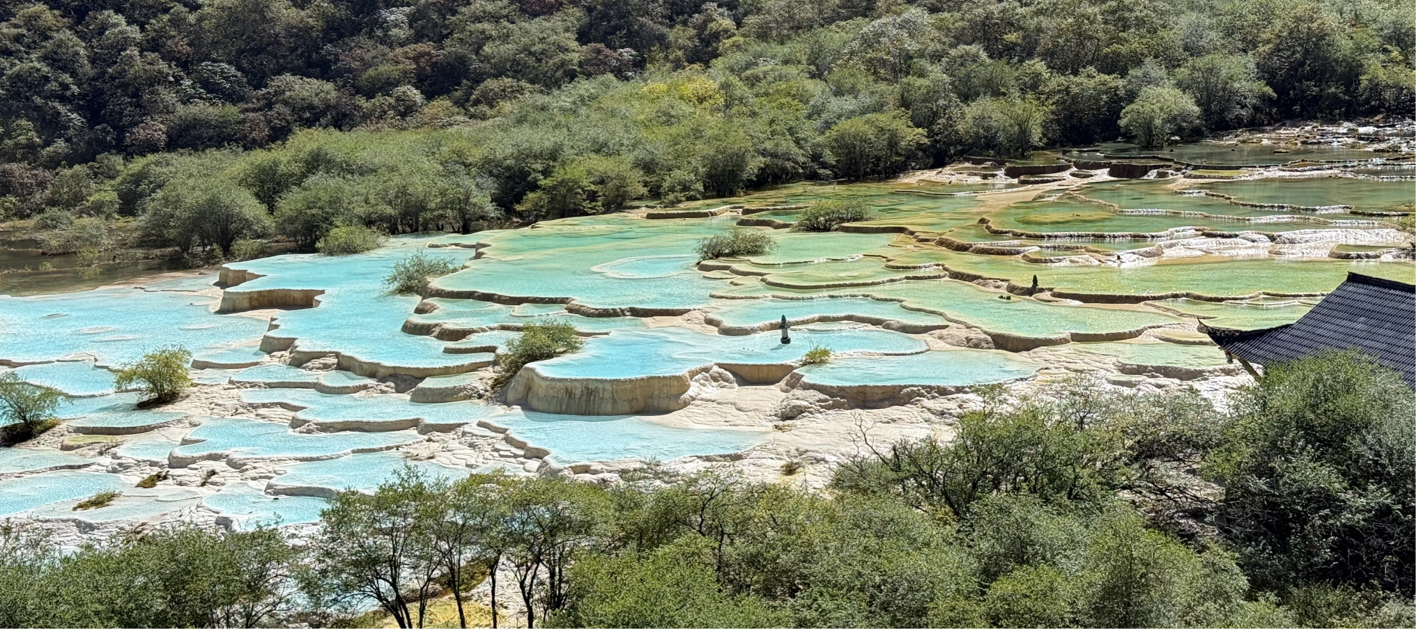一番の見所は五彩池(ごさいち)です。棚田状になっていて、トルコのパムッカレに似ています。石灰華段丘と言うそうです。九寨溝にもありました。緑から青へ、色の移り変わりが美しい。